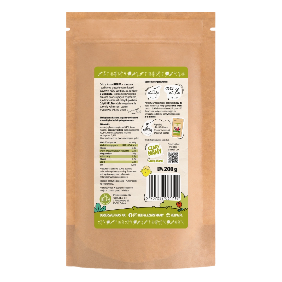 | Skład: | ekologiczna kaszka jaglana (50%), kasza manna orkiszowa biała ekologiczna (49,5%), wanilia burbońska mielona ekologiczna (0,5%) |